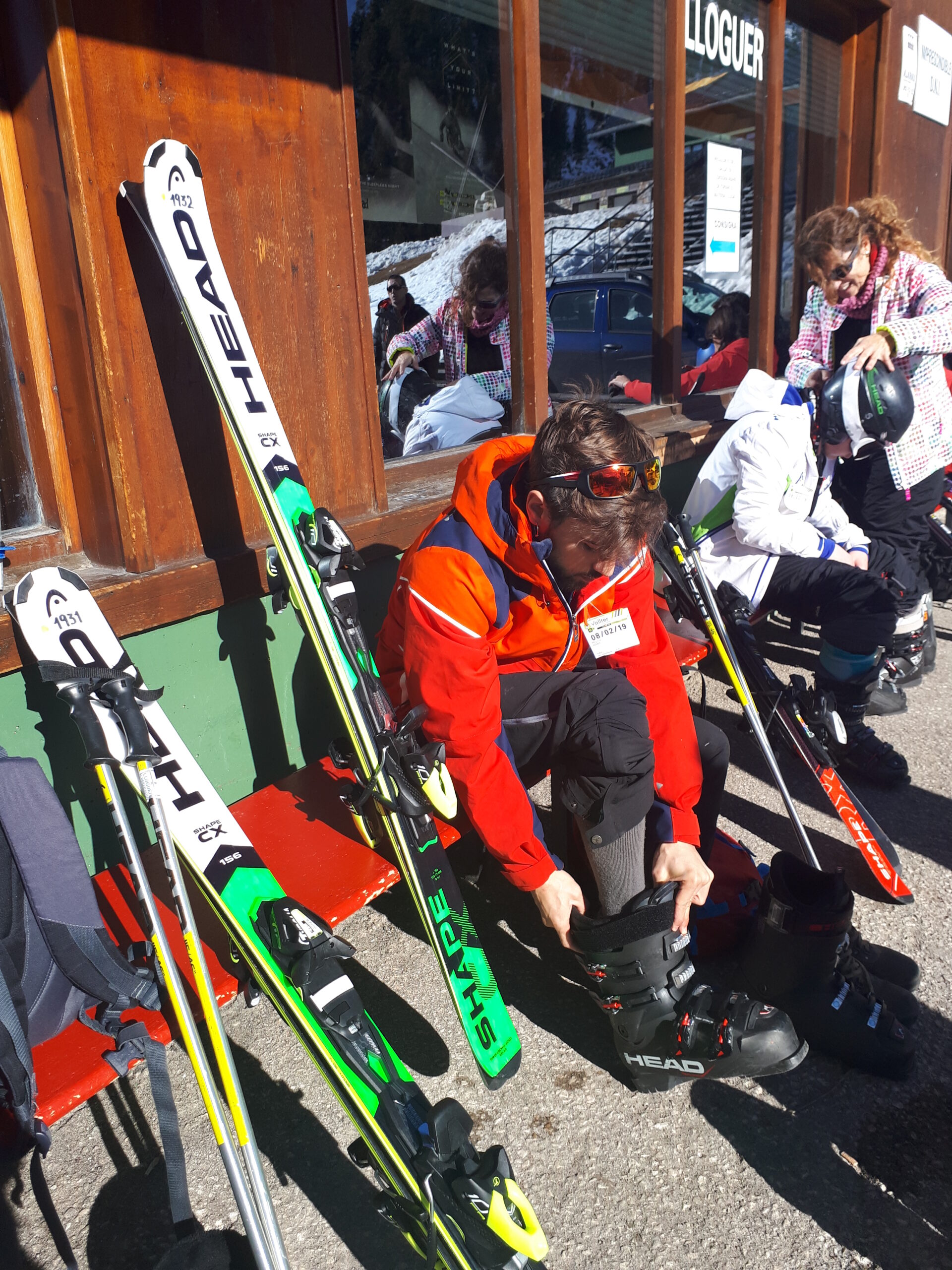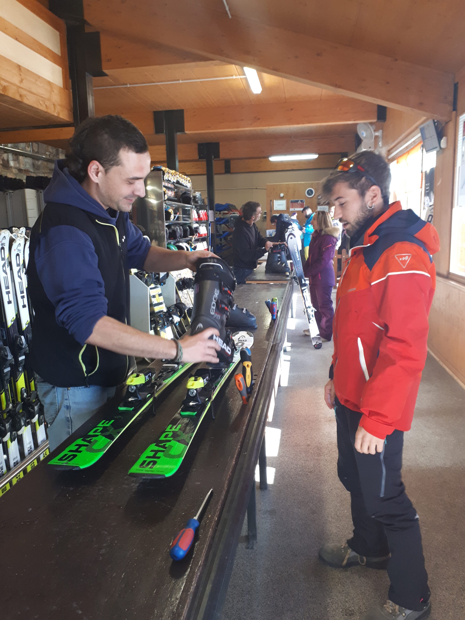 Arribem a les 9 a peu de pistes i anem directes a agafar el material per esquiar: botes, esquís i pals! Els companys i companyes de l’estació prèviament, enceren, llimen els cantons els esquís i netegen per a que trobem en les millors condicions el material.